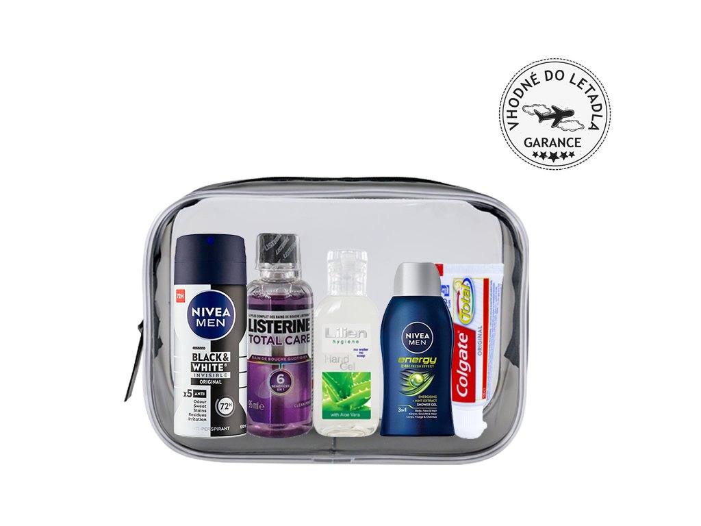 Na cestě za poznáváním nových krajin, lidí a kultur musíte častokrát překonat množství překážek. Usnadněte si hledání a objevování nových zážitků s cestovní kosmetickou sadou, která Vás okouzlí svou sterilitou. Hygienická sada obsahuje sprchový gel se šamponem NIVEA, deodorant STR8, zubní pastu Colgate, ústní vodu Listerine a dezinfekční gel Lilien.